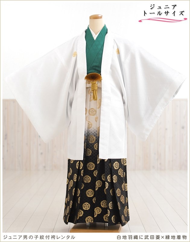 身長高め 158cm〜167cm対応 小学校卒業式 ジュニア 男の子 紋付袴レンタル 十三参り 小学生 jbmo822-4 メンズ 12歳前後 羽織袴 フルセット 着物レンタル 貸衣装 kimono イベント 和服 白地羽織に武田菱×緑地着物