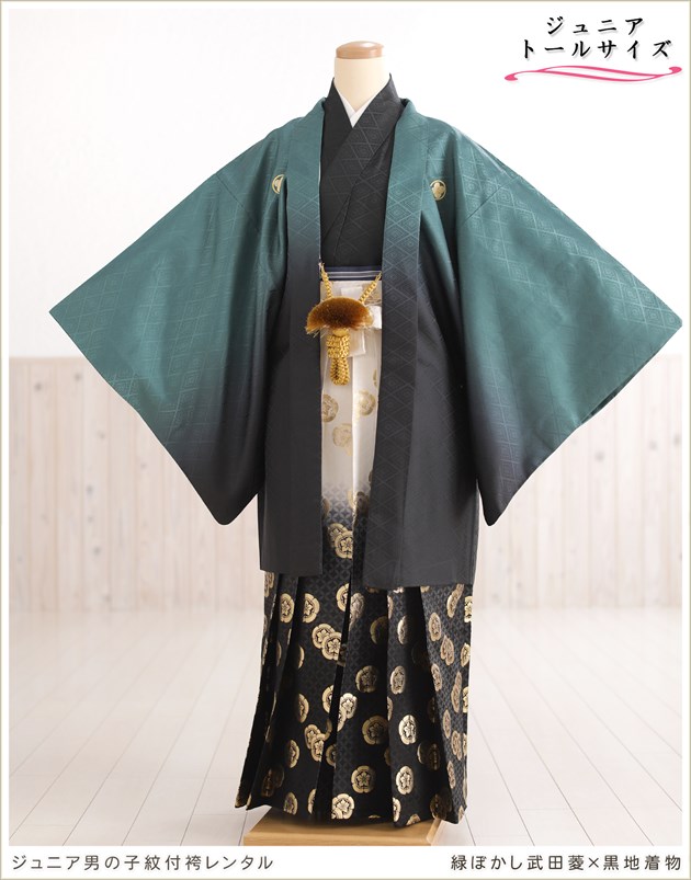 身長高め 158cm〜167cm対応 小学校卒業式 ジュニア 男の子 紋付袴レンタル 十三参り 小学生 jbmo085-4 メンズ 12歳前後 羽織袴 フルセット 着物レンタル 貸衣装 kimono イベント 和服 緑ぼかし慶び黒金亀甲袴