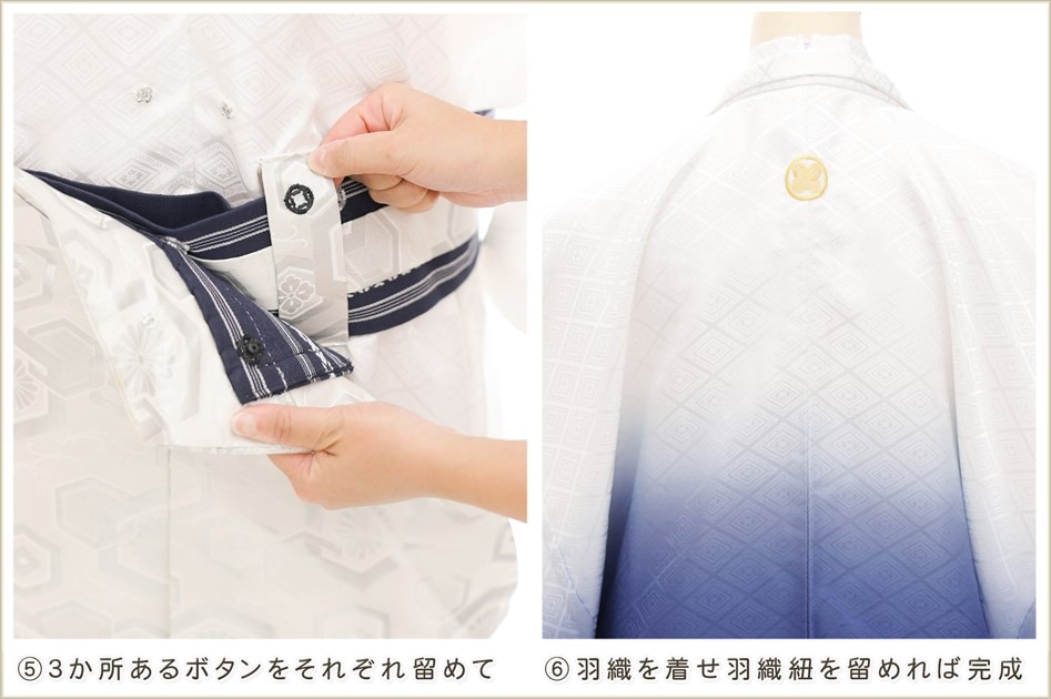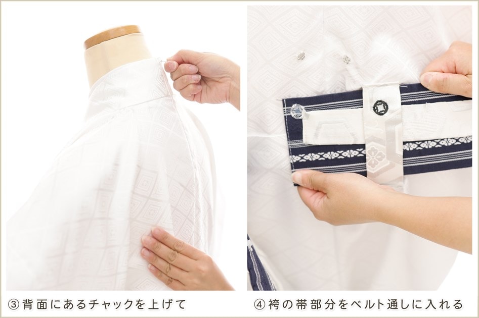 1・足袋を履いて、着物のチャックを広げる 2・着物を置いて足から入る 3・手を通してチャックを一番上まで上げ、袴の紐をベルトを通す 4・3つのボタンを留めて、羽織を着せたら完成! (※チャックは型崩れしないように少し硬め仕様になっております。) ※約3分で誰でも簡単に着付けが可能です ※付属のサスペンダーで身長に合わせて袴の長さ調整も可能です ◆着せ方の簡易動画はこちらから