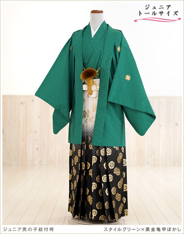 身長高め 158cm〜167cm対応 小学校卒業式 ジュニア 男の子 紋付袴レンタル 十三参り 小学生 jbmo085-4 メンズ 12歳前後 羽織袴 フルセット 着物レンタル 貸衣装 kimono イベント 和服 緑ぼかし慶び黒金亀甲袴