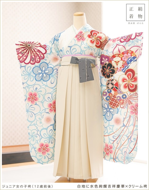 joh8044 (白地に水色絢爛吉祥慶華×クリーム袴 /十三参り・卒業式/女の子ジュニア用袴)