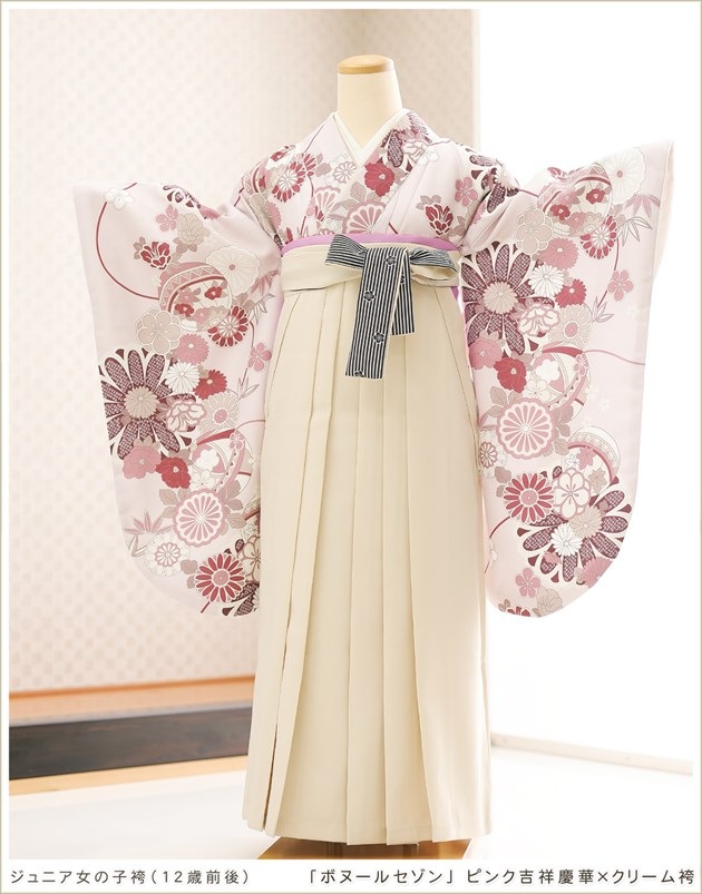 joh5175 (「ボヌールセゾン」ブランド ピンク吉祥慶華×クリーム袴 /十三参り・卒業式/女の子ジュニア袴)