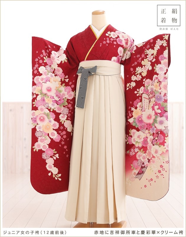 joh1418 (赤地に吉祥御所車と慶彩華×クリーム袴 /十三参り・卒業式/女の子ジュニア用袴)