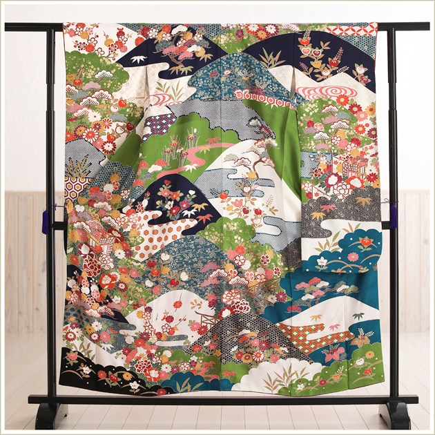 着物、長襦袢、袋帯、帯〆、帯揚げ、重ね衿、和装肌着、足袋、腰紐(5本)、伊達締め(2本)、帯板(大1枚小1枚)、ボテ(帯枕)、コーリンベルト、三重ひも、衿芯、草履、バッグ、髪飾り(オプション)