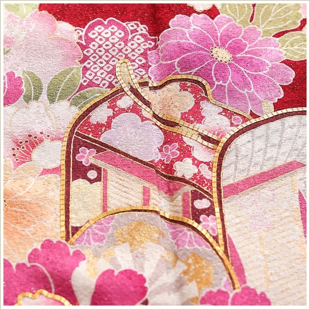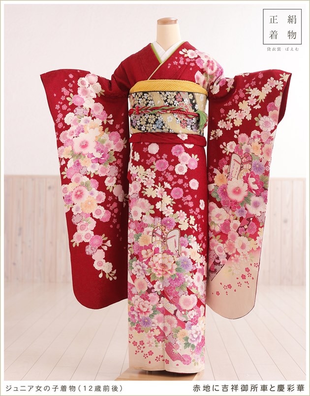 jkfb1418 (赤地に吉祥御所車と慶彩華/女の子ジュニア着物)