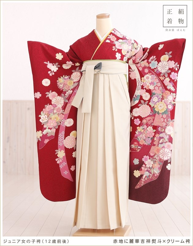 joh1398 (赤地に麗華吉祥熨斗×クリーム袴 /十三参り・卒業式/女の子ジュニア用袴)