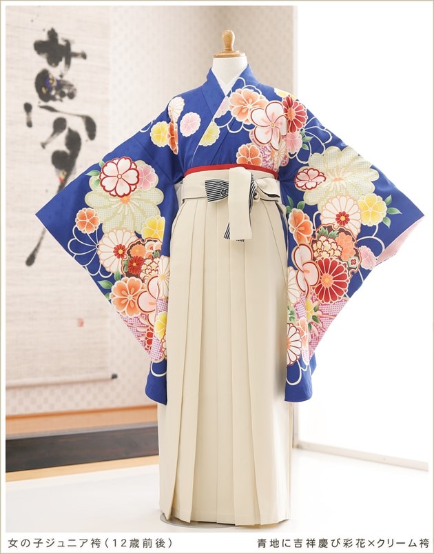 h0754(青地に吉祥慶び彩花×クリーム袴 /十三参り・卒業式/女の子ジュニア用袴/フルセットレンタル)