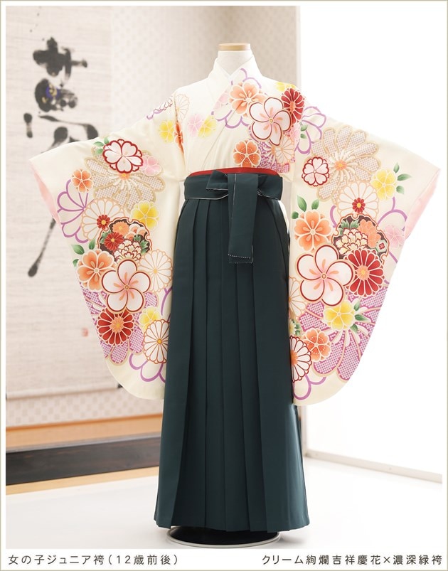 h0755(クリーム絢爛吉祥慶花×濃深緑袴 /十三参り・卒業式/女の子ジュニア用袴/フルセットレンタル)