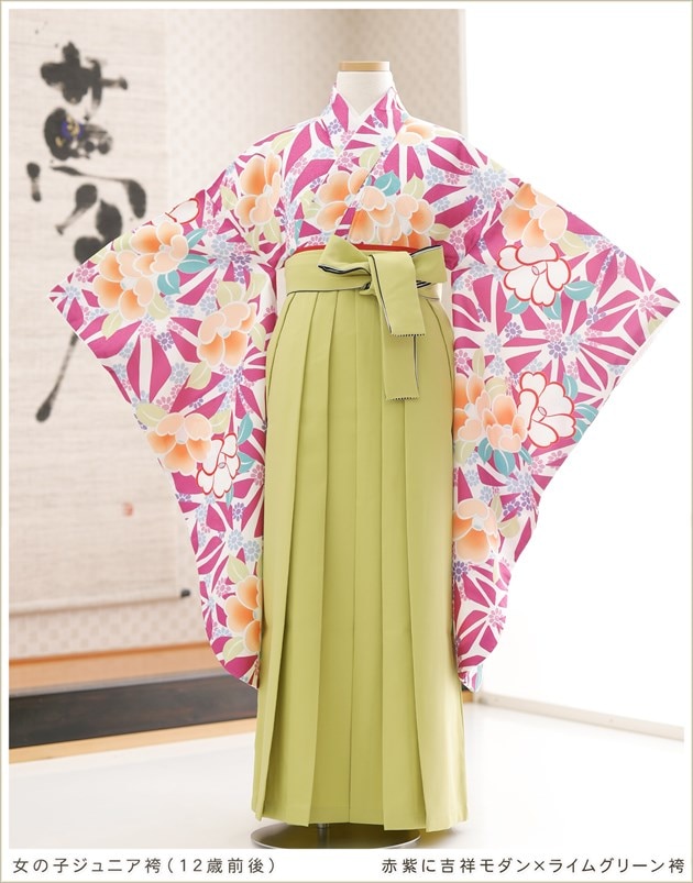 h0758(赤紫に吉祥モダン×ライムグリーン袴 /十三参り・卒業式/女の子ジュニア用袴/フルセットレンタル)