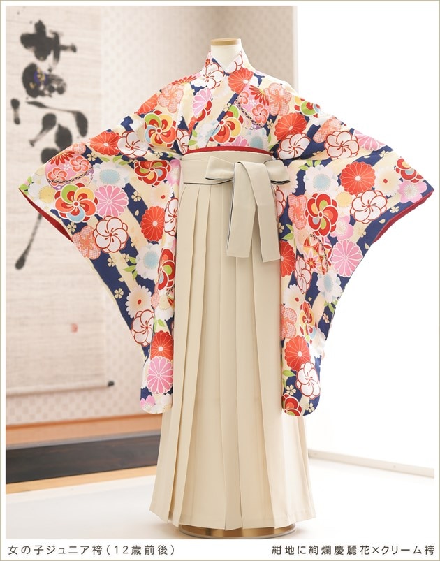 h0932-2(紺地に絢爛慶麗花×クリーム袴 /十三参り・卒業式/女の子ジュニア用袴/フルセットレンタル)