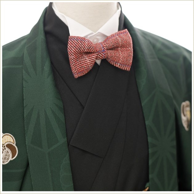 こちらの商品は通常の着物スタイルに加え 着物の下にYシャツを着用いただくことで洋風な蝶ネクタイスタイルとしてもご利用いただけます。 写真撮影とイベント当日で違うスタイルにすることも可能ですので晴れ日の思い出をより多く残してください。 ※蝶ネクタイはワンタッチのタイピン仕様で簡単に位置調整・脱着が可能です。