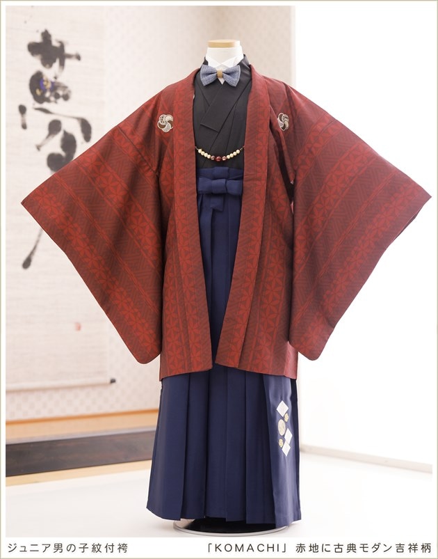 jmo173(12歳前後ジュニア羽織袴 「KOMACHI」ブランド 赤地に古典モダン吉祥柄 /洋風2wayスタイル)