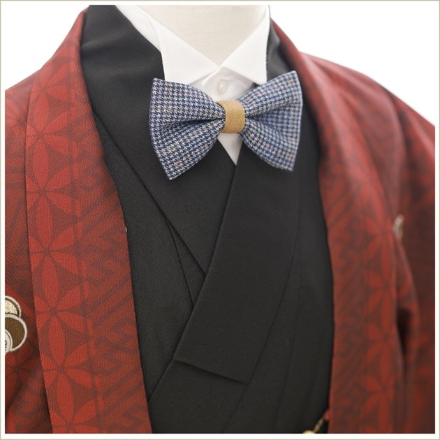 こちらの商品は通常の着物スタイルに加え 着物の下にYシャツを着用いただくことで洋風な蝶ネクタイスタイルとしてもご利用いただけます。 写真撮影とイベント当日で違うスタイルにすることも可能ですので晴れ日の思い出をより多く残してください。 ※蝶ネクタイはワンタッチのタイピン仕様で簡単に位置調整・脱着が可能です。
