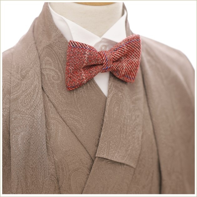 こちらの商品は通常の着物スタイルに加え 着物の下にYシャツを着用いただくことで洋風な蝶ネクタイスタイルとしてもご利用いただけます。 写真撮影とイベント当日で違うスタイルにすることも可能ですので晴れ日の思い出をより多く残してください。 ※蝶ネクタイはワンタッチのタイピン仕様で簡単に位置調整・脱着が可能です。