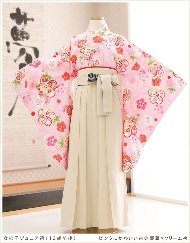 h0744(ピンクにかわいい古典慶華×クリーム袴 /十三参り・卒業式/女の子ジュニア用袴/フルセットレンタル)