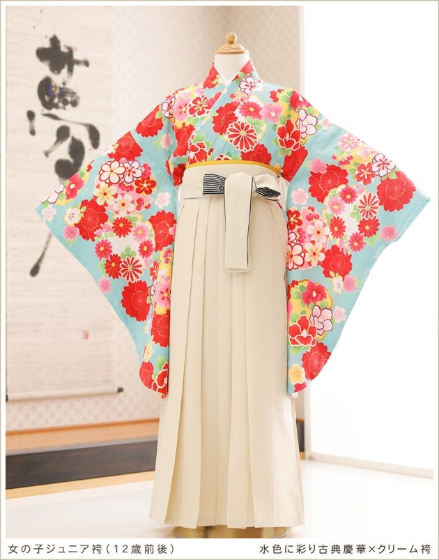 h0745(水色に彩り古典慶華×クリーム袴 /十三参り・卒業式/女の子ジュニア用袴/フルセットレンタル)