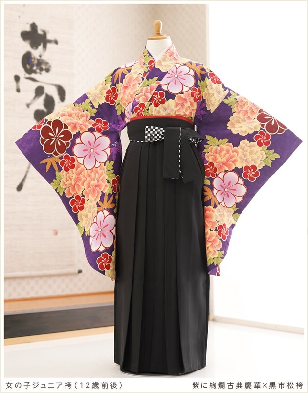 h0746(紫に絢爛古典慶華×黒市松袴 /十三参り・卒業式/女の子ジュニア用袴/フルセットレンタル)