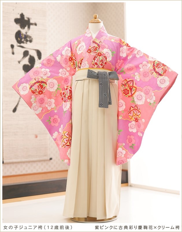 h0749(紫ピンクに古典彩り慶鞠花×クリーム袴 /十三参り・卒業式/女の子ジュニア用袴/フルセットレンタル)