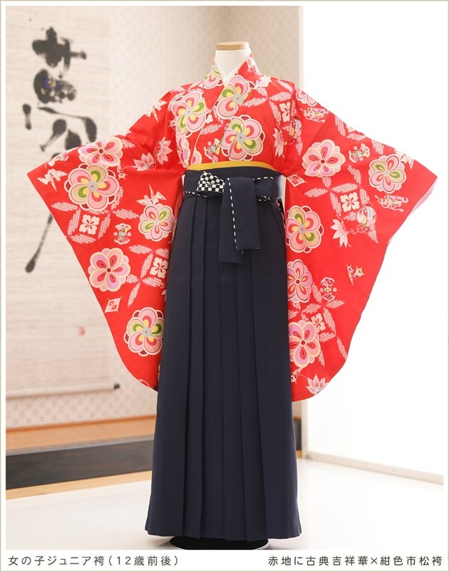 h0750(赤地に古典吉祥華×紺色市松袴 /十三参り・卒業式/女の子ジュニア用袴/フルセットレンタル)