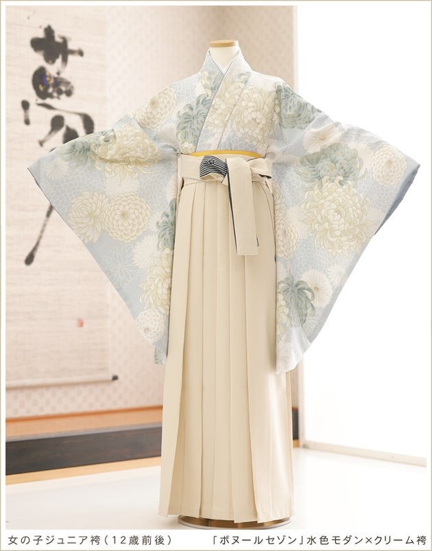 h0759(「ボヌールセゾン」ブランド 水色モダン×クリーム袴 /十三参り・卒業式/女の子ジュニア用袴/フルセットレンタル)