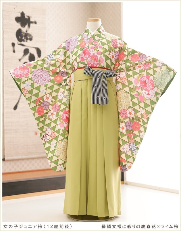 h0923-2(白×緑鱗文様に彩りの慶春花/小学校卒業式/女の子ジュニア用袴)