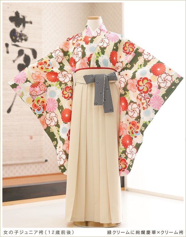 h0921-2(緑×クリームに絢爛慶春麗花/小学校卒業式/女の子ジュニア用袴)