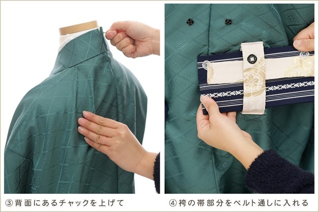 1・足袋を履いて、着物のチャックを広げる 2・着物を置いて足から入る 3・手を通してチャックを一番上まで上げ、袴の紐をベルトを通す 4・3つのボタンを留めて、羽織を着せたら完成! (※チャックは型崩れしないように少し硬め仕様になっております。) ※約90秒で誰でも簡単に着付けが可能です ※付属のサスペンダーで身長に合わせて袴の長さ調整も可能です ◆着せ方の簡易動画はこちらから