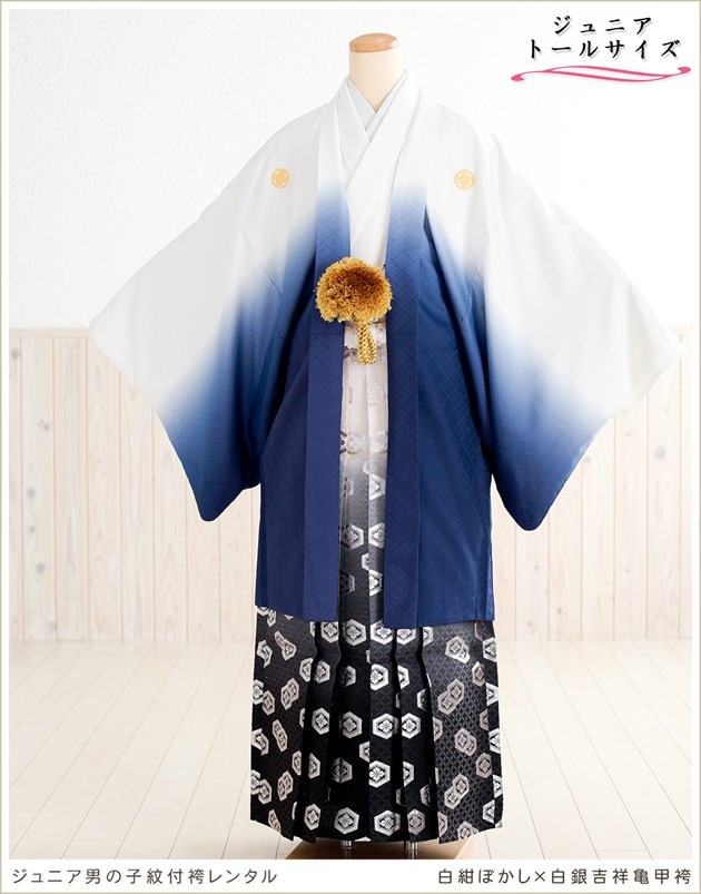 身長高め 158cm〜167cm対応 小学校卒業式 ジュニア 男の子 紋付袴レンタル 十三参り 小学生 jbmo018-4 メンズ 12歳前後 羽織袴 フルセット 着物レンタル 貸衣装 kimono イベント 和服 ホワイトスタイル×黒銀ぼかし袴
