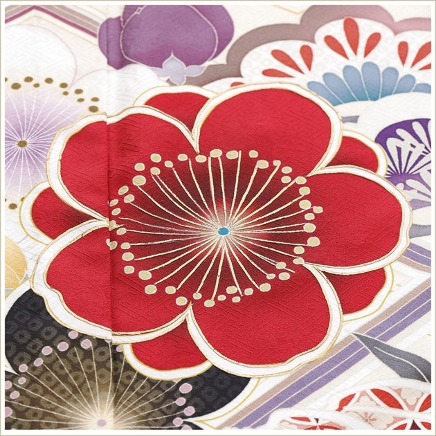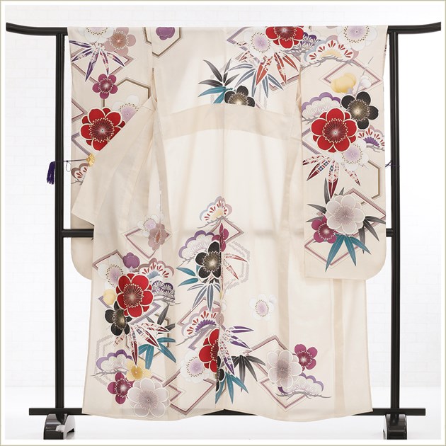 着物、長襦袢、袋帯、帯〆、帯揚げ、重ね衿、和装肌着、足袋、腰紐(5本)、伊達締め(2本)、帯板(大1枚小1枚)、ボテ(帯枕)、コーリンベルト、三重ひも、衿芯、草履、バッグ、髪飾り(オプション)