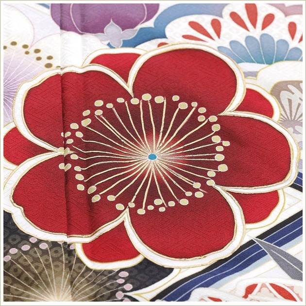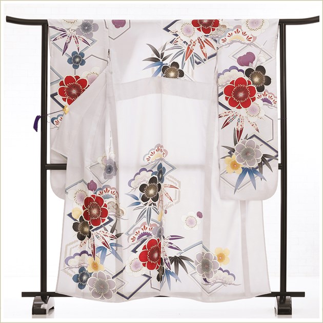 着物、長襦袢、袋帯、帯〆、帯揚げ、重ね衿、和装肌着、足袋、腰紐(5本)、伊達締め(2本)、帯板(大1枚小1枚)、ボテ(帯枕)、コーリンベルト、三重ひも、衿芯、草履、バッグ、髪飾り(オプション)