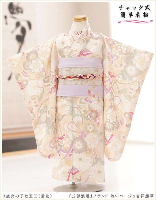 新開発 感動楽チャック着物レンタル 簡単着付け 3歳 女の子 七五三 zj3005 帯姿 作り帯 チャックを上げるだけ ワンタッチ 自分で 着崩れしない 95cm前後 フルセット 753 子供 ファスナー着物 お祭り 初詣 イベント 人気 かわいい「式部浪漫」ブランド クリームに吉祥疋田慶華