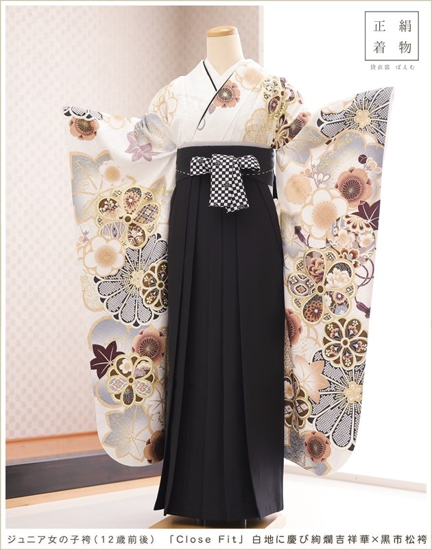 joh1535 (「Close Fit」ブランド 白地に慶び絢爛吉祥華×黒市松袴 /十三参り・卒業式/女の子ジュニア用袴)