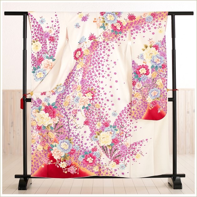 着物、長襦袢、袋帯、帯〆、帯揚げ、重ね衿、和装肌着、足袋、腰紐(5本)、伊達締め(2本)、帯板(大1枚小1枚)、ボテ(帯枕)、コーリンベルト、三重ひも、衿芯、草履、バッグ、髪飾り(オプション)