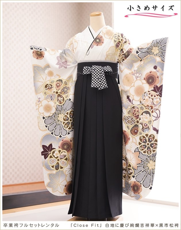 fboh1535(卒業袴レンタル 「Close Fit」ブランド 白地に慶び絢爛吉祥華×黒市松袴/大人女性用/着物レンタル)