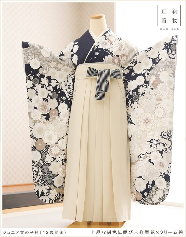 joh1533 (上品な紺色に慶び吉祥聖花×クリーム袴 /十三参り・卒業式/女の子ジュニア用袴)