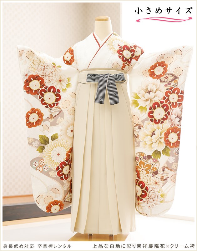小さめサイズ 卒業式 袴レンタル fboh1532 着物レンタル 卒業袴 フルセット 女性 大学 短大 専門学校 振袖袴 高校 中学校 小学校 卒業式袴 3月 4月 高級 袴 人気 春 往復送料無料 上品な白地に吉祥慶茉白花×クリーム袴