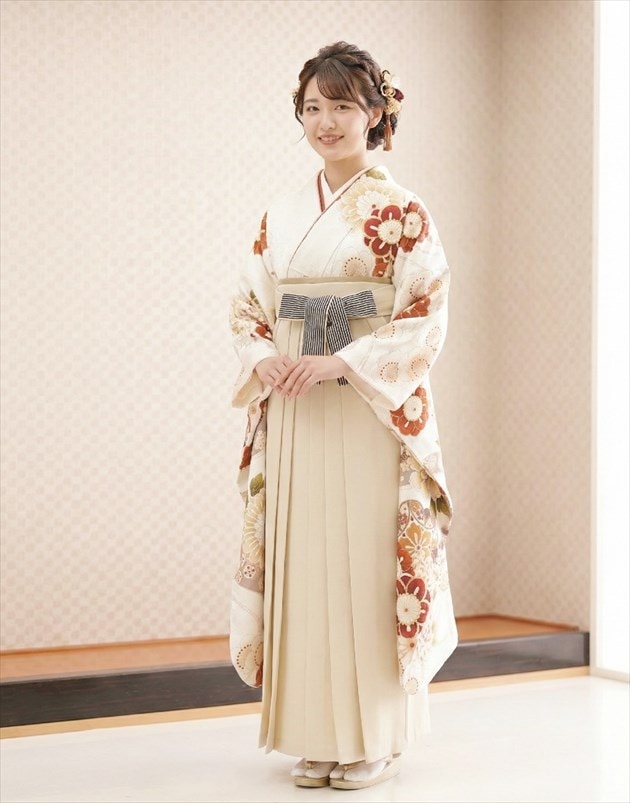 fboh1530 (卒業袴レンタル 上品な白地に彩り吉祥慶陽花×クリーム袴/大人女性用/着物レンタル)
