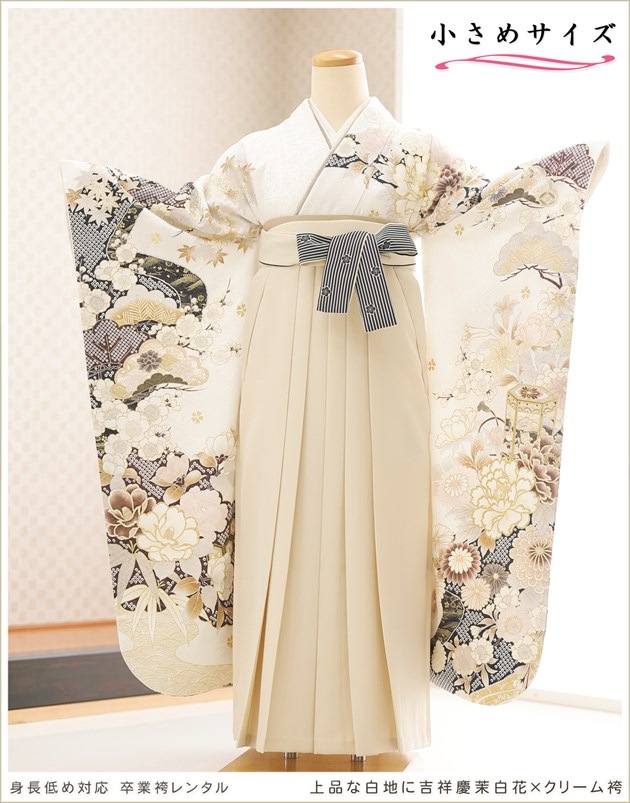 小さめサイズ 卒業式 袴レンタル fboh1530 着物レンタル 卒業袴 フルセット 女性 大学 短大 専門学校 振袖袴 高校 中学校 小学校 卒業式袴 3月 4月 高級 袴 人気 春 往復送料無料 上品な白地に彩り吉祥慶陽花×クリーム袴