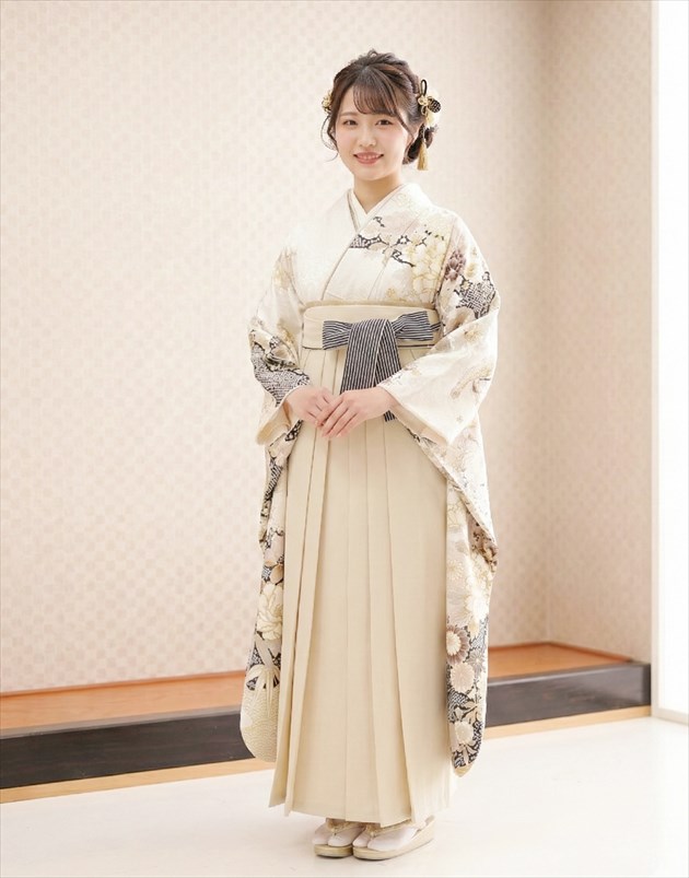 fboh1532 (卒業袴レンタル 上品な白地に吉祥慶茉白花×クリーム袴/大人女性用/着物レンタル)