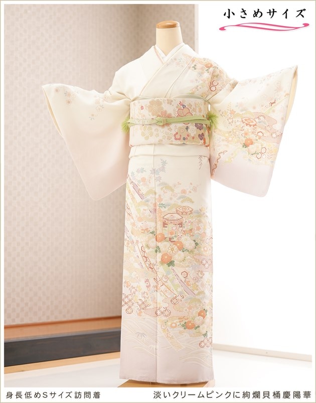 訪問着レンタル 小さいサイズ 小さめSサイズ hw1689s 卒業式 着物レンタル 母 入学式 結婚式 七五三 ママ 正絹 フルセット お宮参り 753 卒園式 母親 kimono 人気 2024 houmongi 往復送料無料 上品なクリームに吉祥貝桶慶華