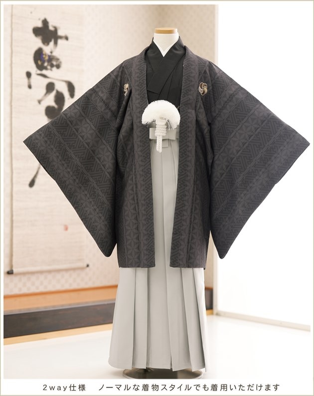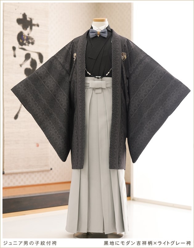 jmo177(12歳前後ジュニア羽織袴 「KOMACHI」ブランド 黒地にモダン吉祥柄×ライトグレー袴 /洋風2wayスタイル)