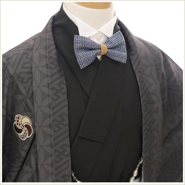 こちらの商品は通常の着物スタイルに加え 着物の下にYシャツを着用いただくことで洋風な蝶ネクタイスタイルとしてもご利用いただけます。 写真撮影とイベント当日で違うスタイルにすることも可能ですので晴れ日の思い出をより多く残してください。 ※蝶ネクタイはワンタッチのタイピン仕様で簡単に位置調整・脱着が可能です。