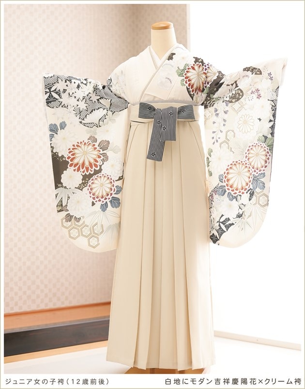 joh5185 (「百華」ブランド 白地にモダン吉祥慶陽花×クリーム袴 /十三参り・卒業式/女の子ジュニア袴)